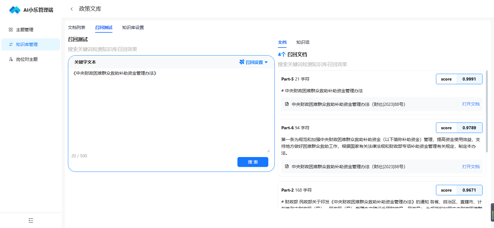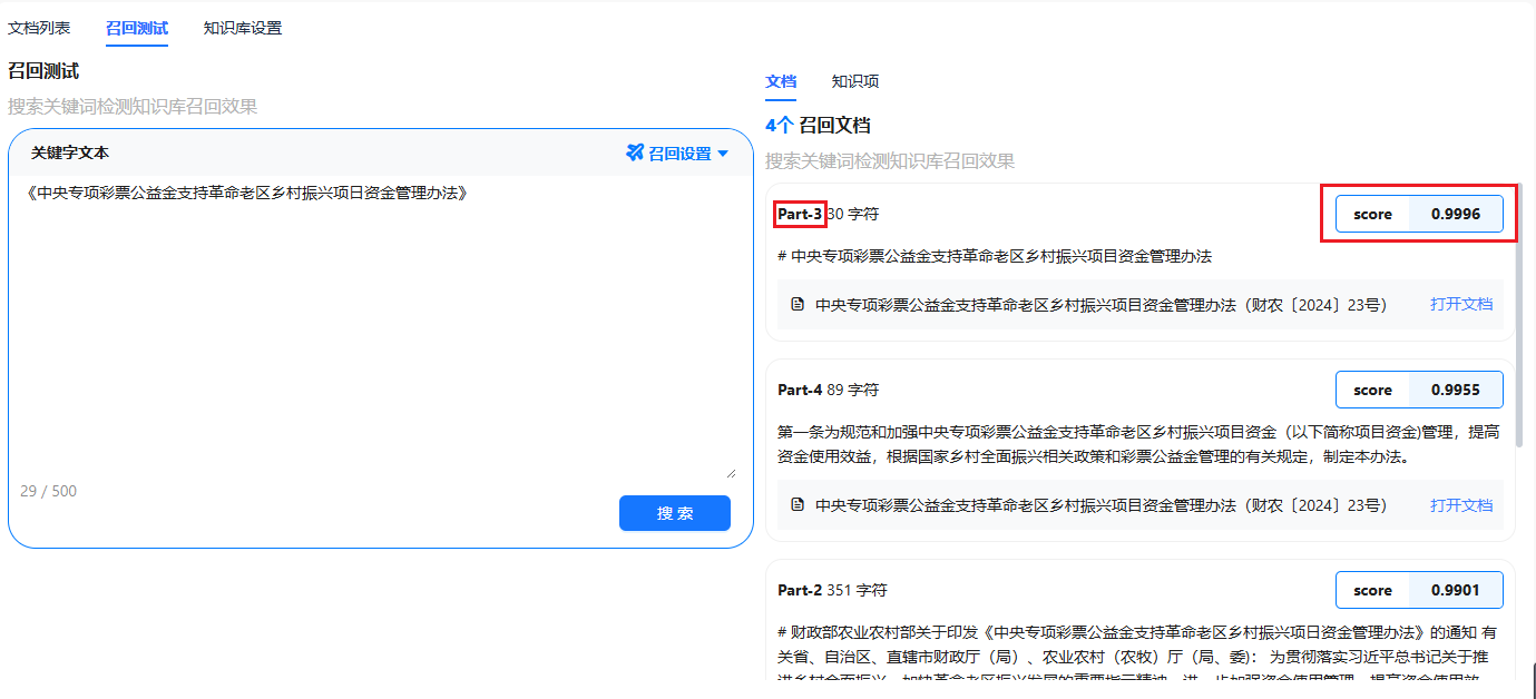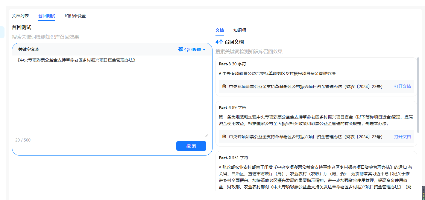 召回设置与知识库配置中的检索设置一致,默认取检索设置配置。修改召回设置之后需要重新点击“搜索”按钮进行召回测试。