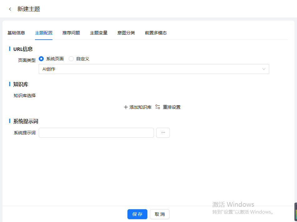 在主题中需要配置URL信息-页面类型选择“系统页面”,下拉框选择“AI创作”。最终预览AI创作效果:
