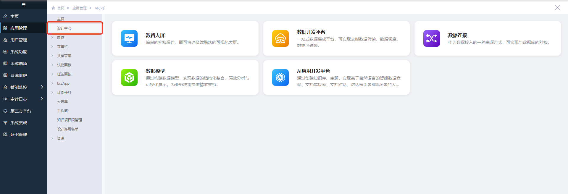 在设计中心点击“AI应用开发平台”模块可以进入AI开发平台后台设计页面,如图所示: