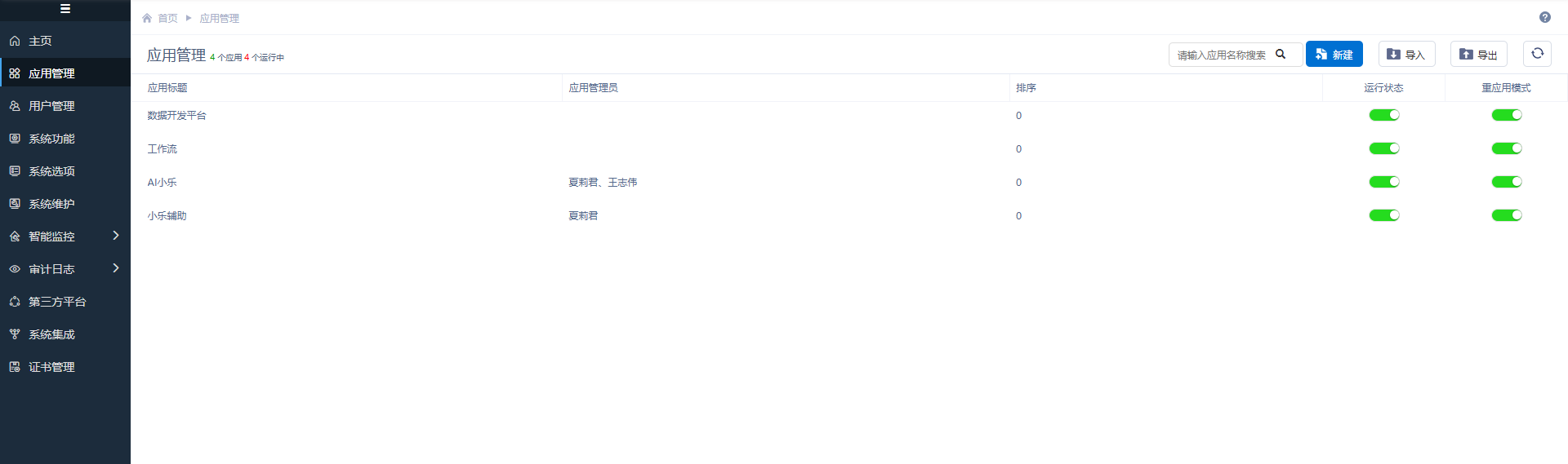 乐创者AI应用开发平时分租户、分应用设计和展示的,在设计AI应用之前先要确认应用,如果没有应用需要自行创建应用。乐创者应用在系统管理员的应用管理中维护,如下图所示: