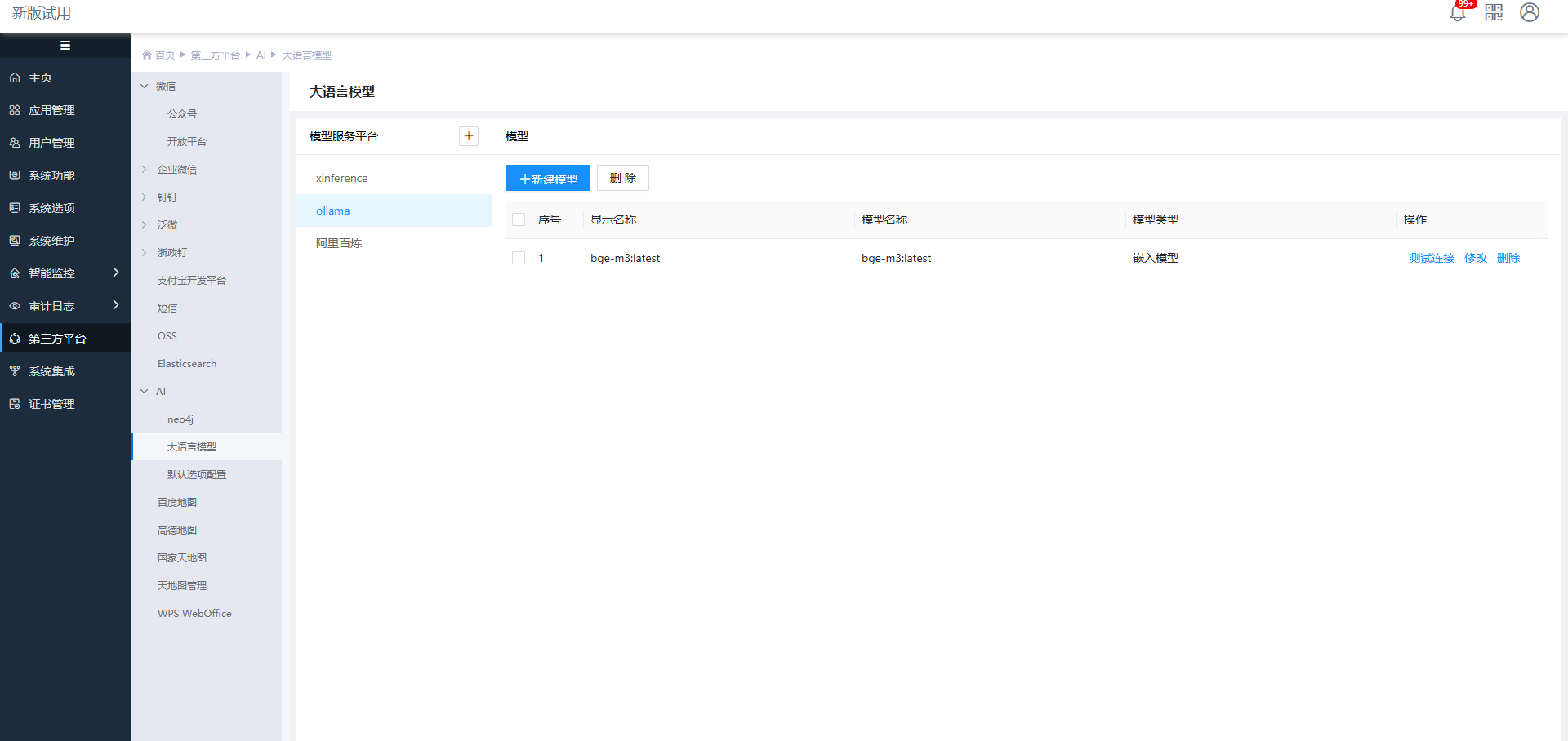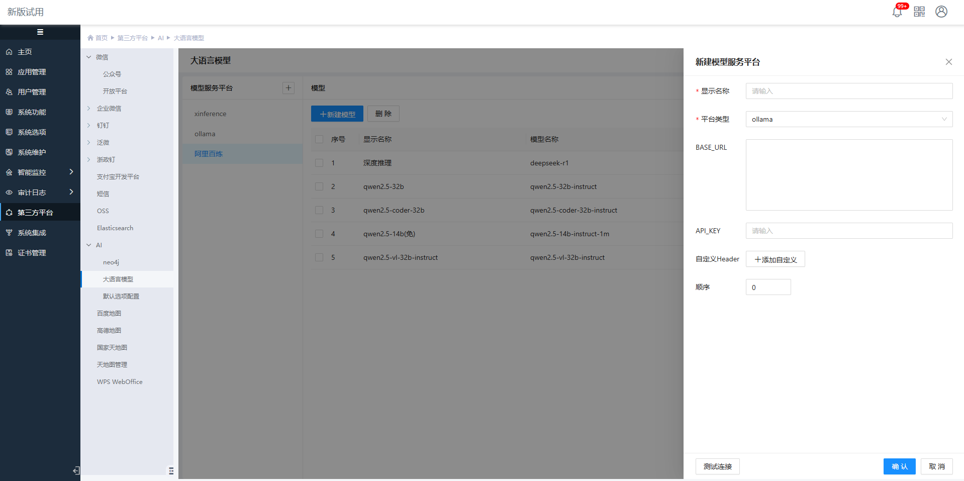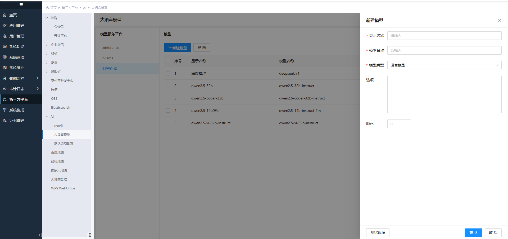 大语言模型服务配置在乐创者系统管理员第三方平台中进行,如下图所示: