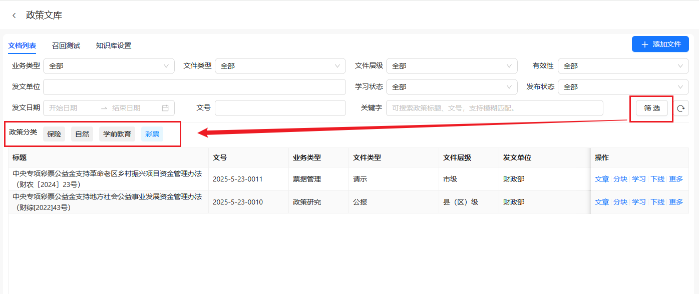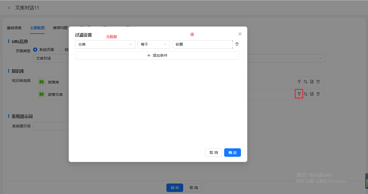 注意:知识库文档筛选仅支持字符类元数据进行筛选
