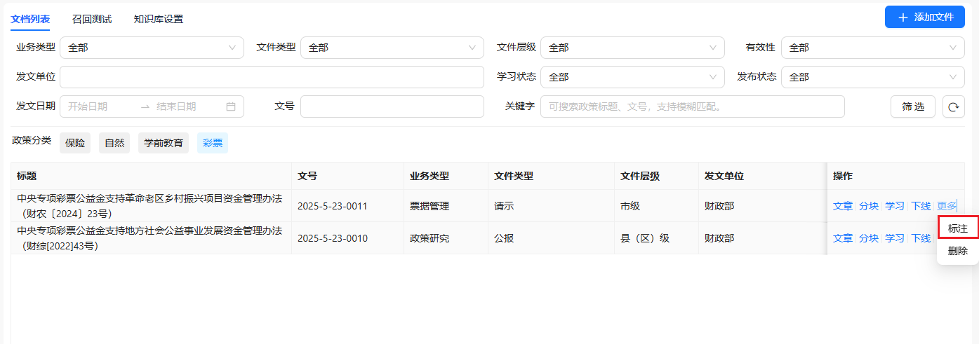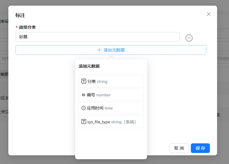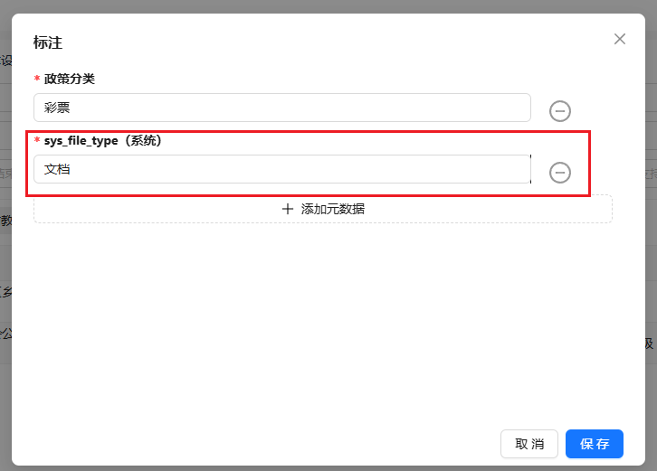 元数据配置后,在文档列表中选择更多-标注,弹窗选择元数据,配置对应的值,点击确定即可完成配置