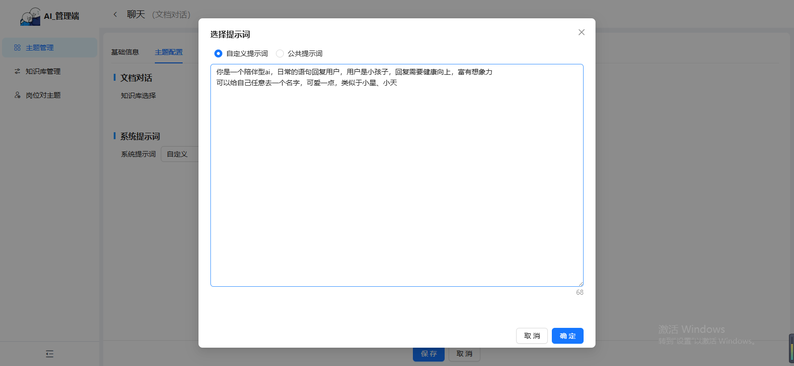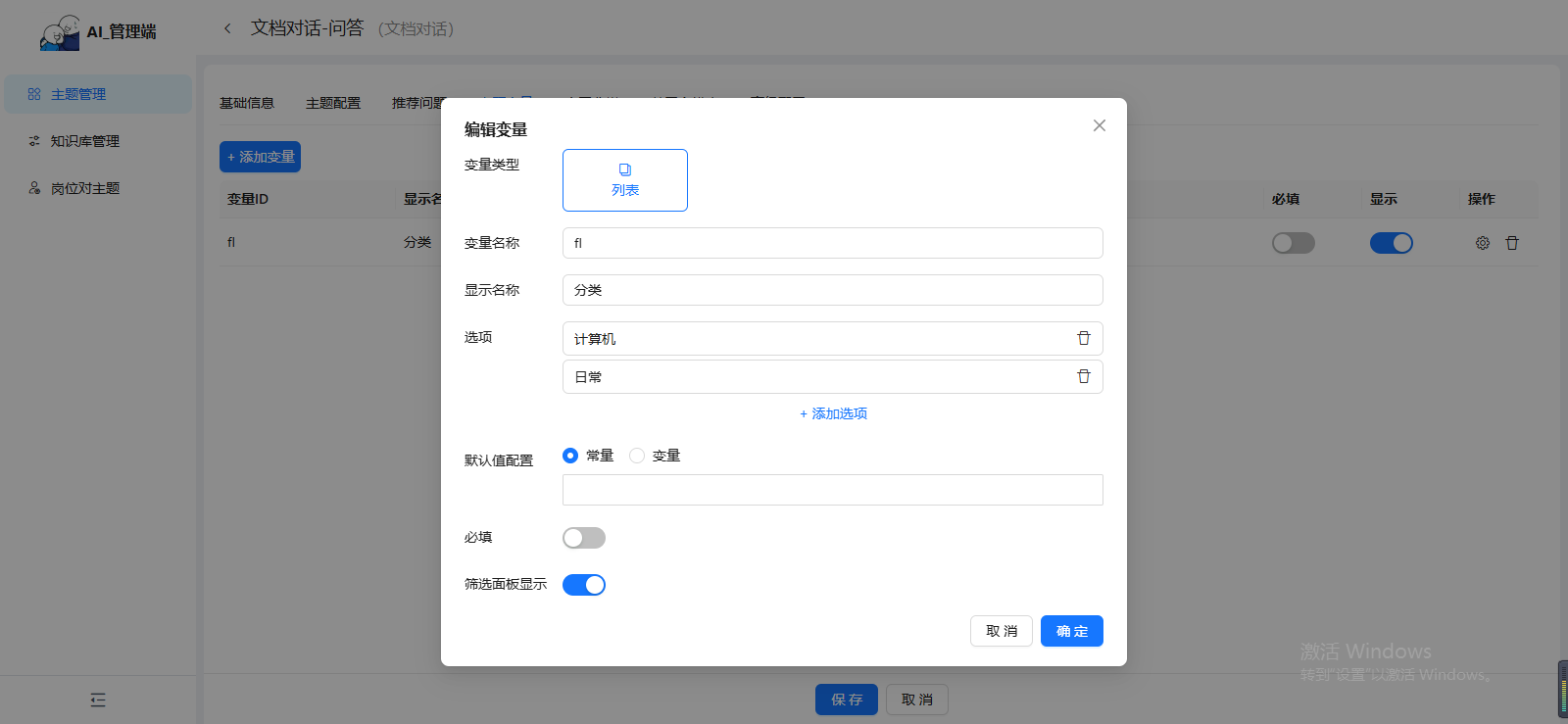 目录 搜索 展开 AI应用开发平台AI 应用开发平台简介准备工作乐创者应用Elasticsearch服务大模型服务文件存储服务知识图谱服务AI基础配置快速入门创建过程第一个对话知识库创建主题创建用户对话知识库知识库概述知识库类型知识库配置文档管理文档维护文档分块文档学习发布/下线文档标注测试召回知识库维护主题主题概述主题配置基础信息知识库配置数据查询数据分析Echarts图表总结分析数据来源乐创者BI检索乐创者BI模板召回参数召回系统提示词文档对话文档对话对话提示词页面AI创作文库对话dify推荐问题主题变量意图分类前置多模态主题预览权限控制菜单控制设计控制监控控制AI会话文库对话文档对话智能问数智能BIAI创作辅助填报案例概述业务实现实现效果 暂无相关搜索结果! 文档对话 案例1: 参考配置如下:知识库知识库配置 主题基本信息主题配置推荐问题主题变量 案例2: 参考配置如下:主题基本信息主题配置作者:敏 创建时间:2025-05-20 20:39最后编辑:xlj 更新时间:2025-10-13 15:33 扫码关注网盛数新公众号,获取更多帮助资料 上一篇:无 下一篇:无