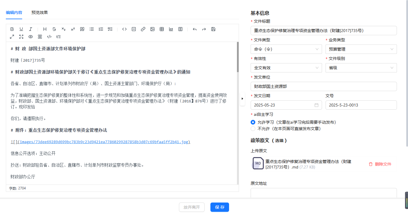- 基本信息:政策类文档特点是有文档相关属性需要配置以及可自行选择是否需要进行ai学习文档,可配置文件名称、文件类型、业务类型等属性,具体按照实际业务配置。