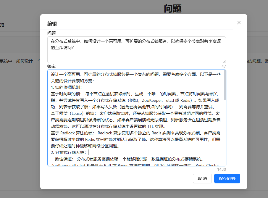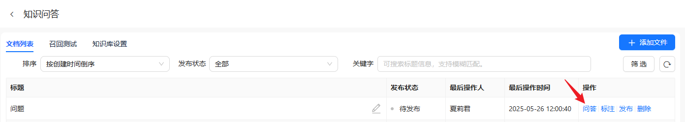 点击“添加文件”设置名称后确定,列表产生新的一条文档记录,点击操作中的“问答”,进入该文档进行添加或编辑问答内容,完成后点击保存即可。