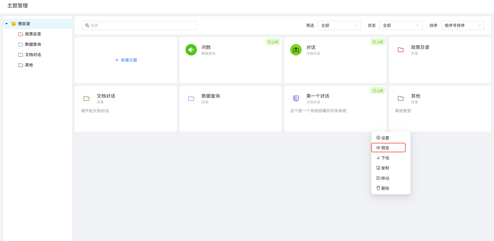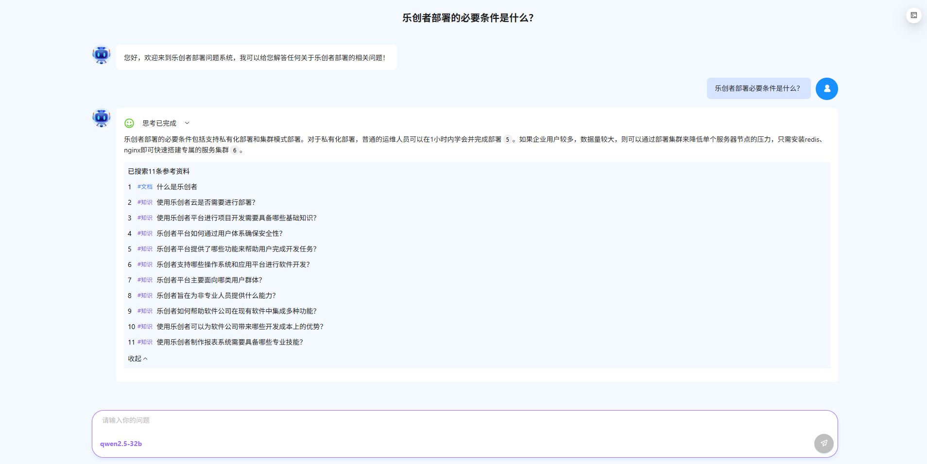 1. 主题预览2. 用户对话1. 主题预览在主题管理页面点击预览操作可以进行主题预览,如下图所示:2. 用户对话在主题预览页面可以可以进行对话,如下图所示:至此,文档对话的主题创建完成。在岗位对主题中进行权限配置,对应用户登录乐创者系统后进入ai助手可以进行对话。作者:敏 创建时间:2025-06-06 09:54最后编辑:敏 更新时间:2025-10-13 15:33