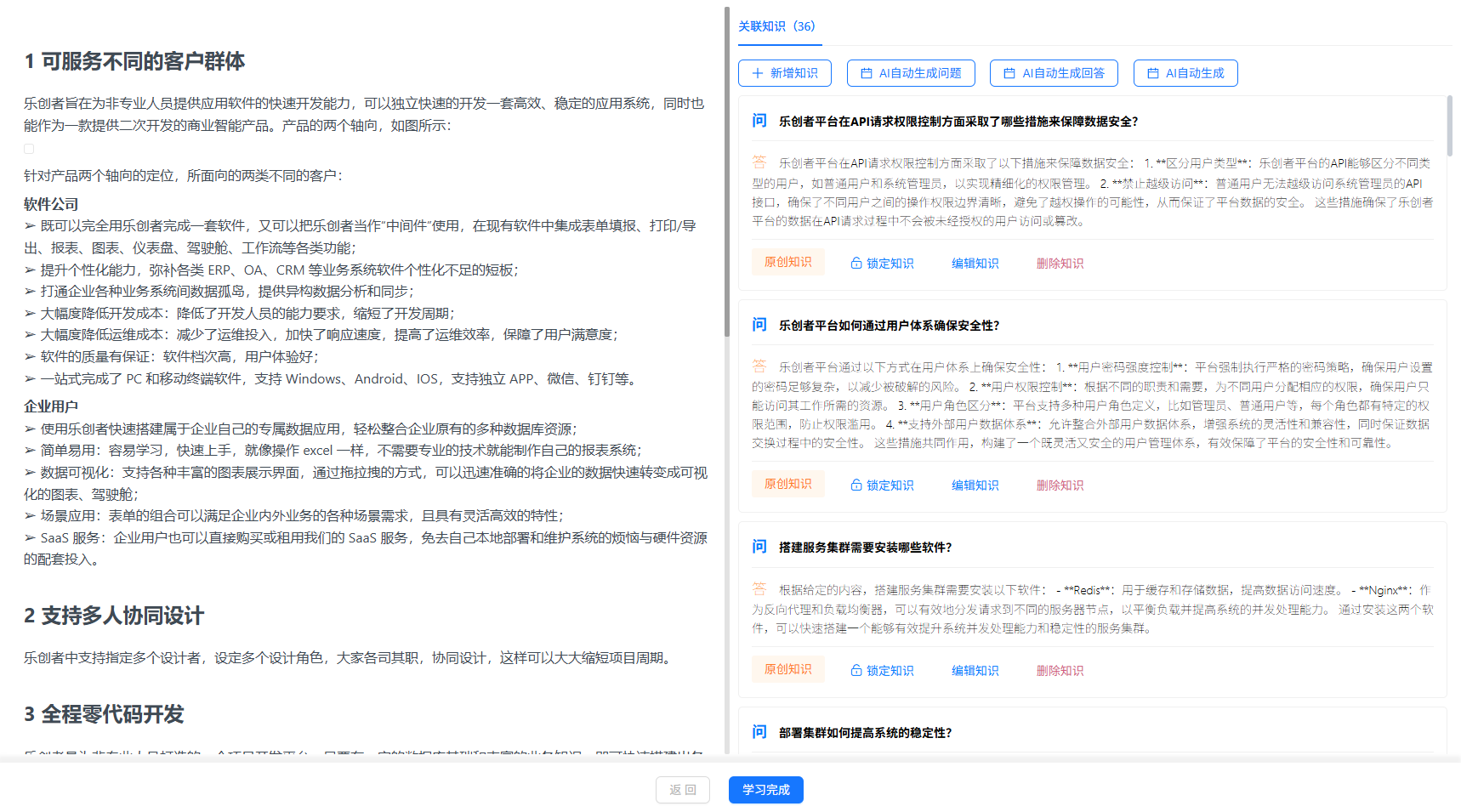 分块完成后进入学习过程,可以又AI自动生成问题、问答等,如下图所示: