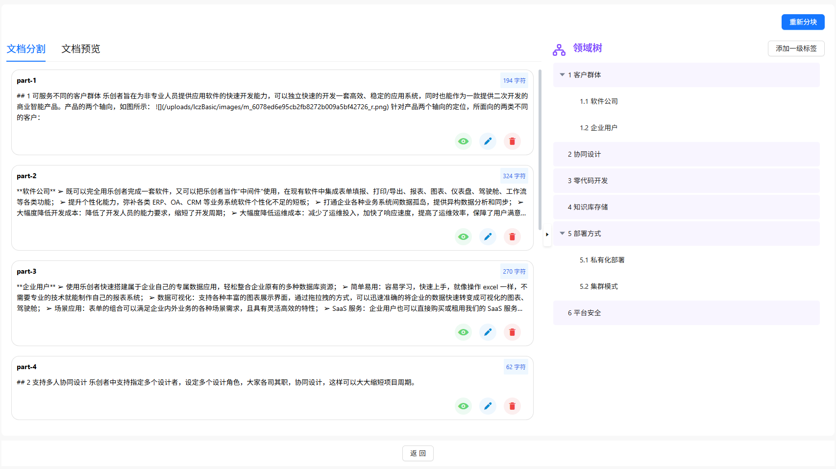 可以在分块结果中进行预览、编辑和删除操作。