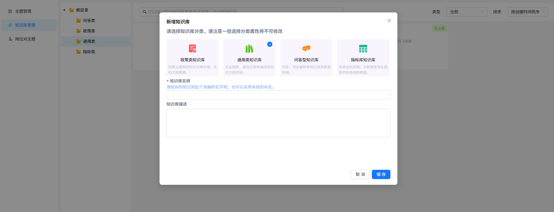 在知识库管理页面创建通用知识库,如下图所示: