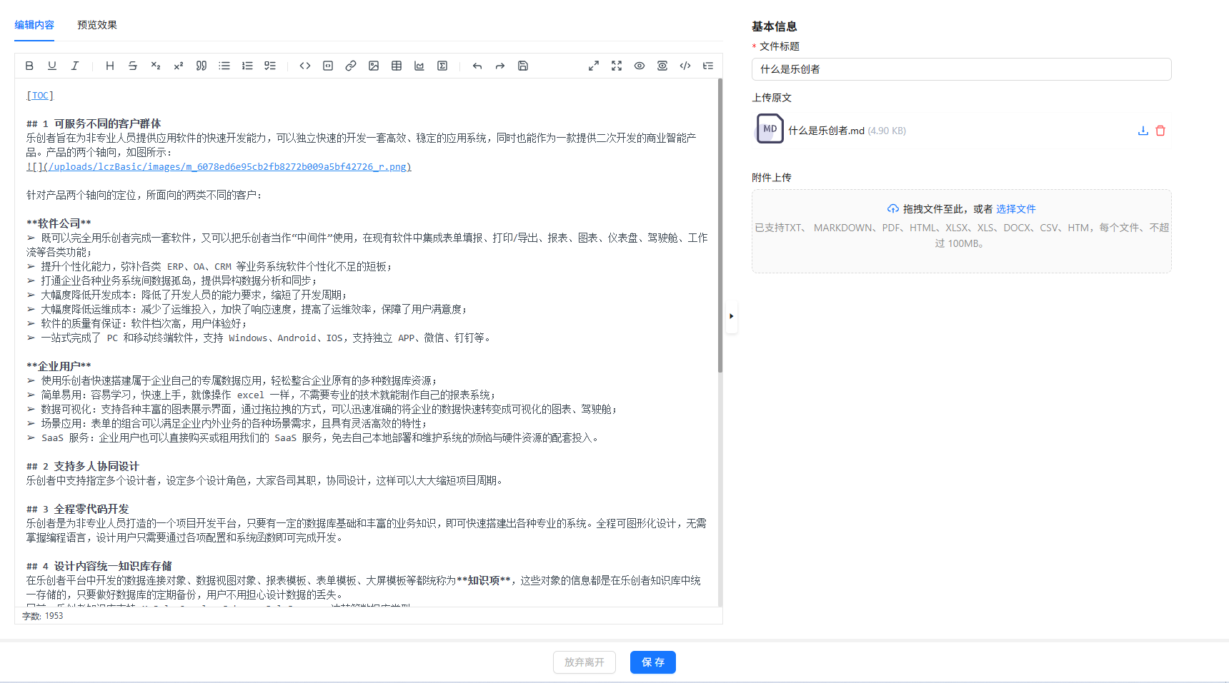 上传文件后可以在编辑区域再次编辑,编辑完成后可以直接在页面进行文件内容预览。