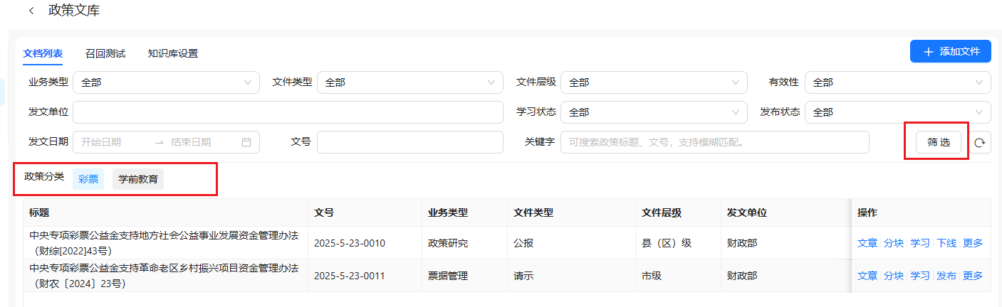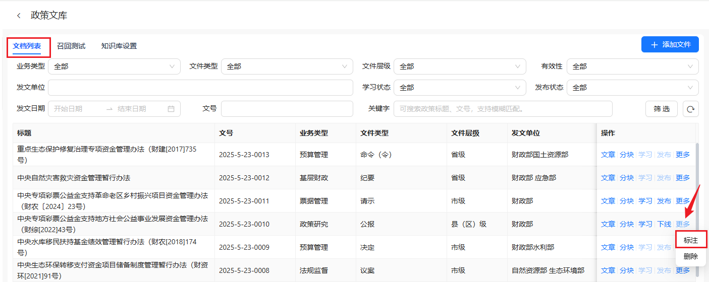 元数据配置完成后,可在文档列表对于单个文档进行标注,对于不同的元数据进行设置值。在文档列表的操作中点击”更多”,选择”标注”:
