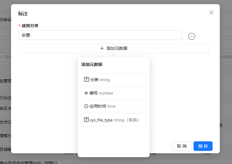 弹出窗口,选择配置的元数据填写对应的值,为文档打上标注。