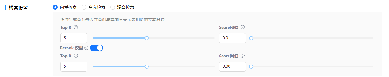 检索设置是我们与ai对话时所使用的检索方式,可选择三种方式:向量检索、全文检索、混合检索,同时在向量检索和全文检索可选择是否开启重排模型,对于检索到的内容重新打分排序得到更加精准的内容。