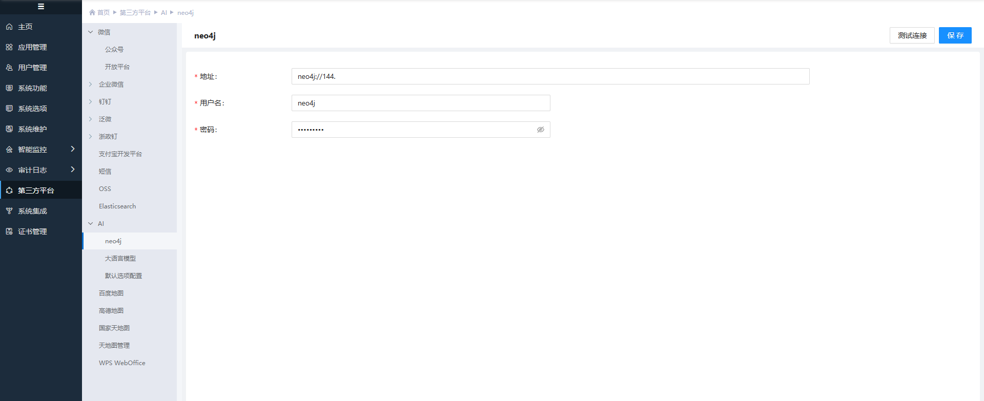 知识图谱是一种以图结构形式组织和表示知识的技术,它通过将实体、概念及其相互关系结构化,使机器能够更好地理解和推理人类知识。neo4j配置乐创者AI应用开发平台使用neo4j作为知识图谱的数据库服务。neo4j配置在乐创者系统管理员第三方平台中进行,如下图所示:地址为neo4访问地址,需要用户名和密码。作者:敏 创建时间:2025-05-21 10:48最后编辑:敏 更新时间:2025-10-13 15:33