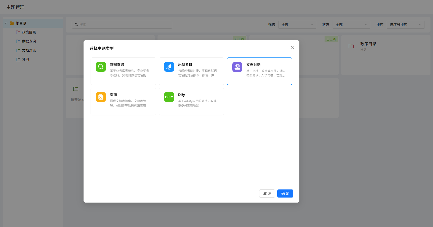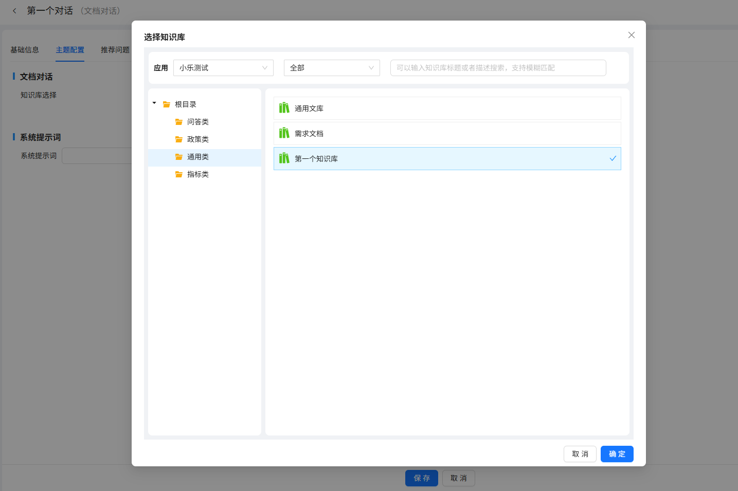 1. 创建主题2. 基础配置3. 添加知识库1. 创建主题在主题管理页面创建文档对话主题,如下图所示:2. 基础配置在主题编辑页面可以配置主题基本信息,如下图所示:3. 添加知识库在主题配置中添加知识库,如下图所示:知识库设置完成后保存,完成主题配置。作者:敏 创建时间:2025-06-06 09:53最后编辑:敏 更新时间:2025-10-13 15:33