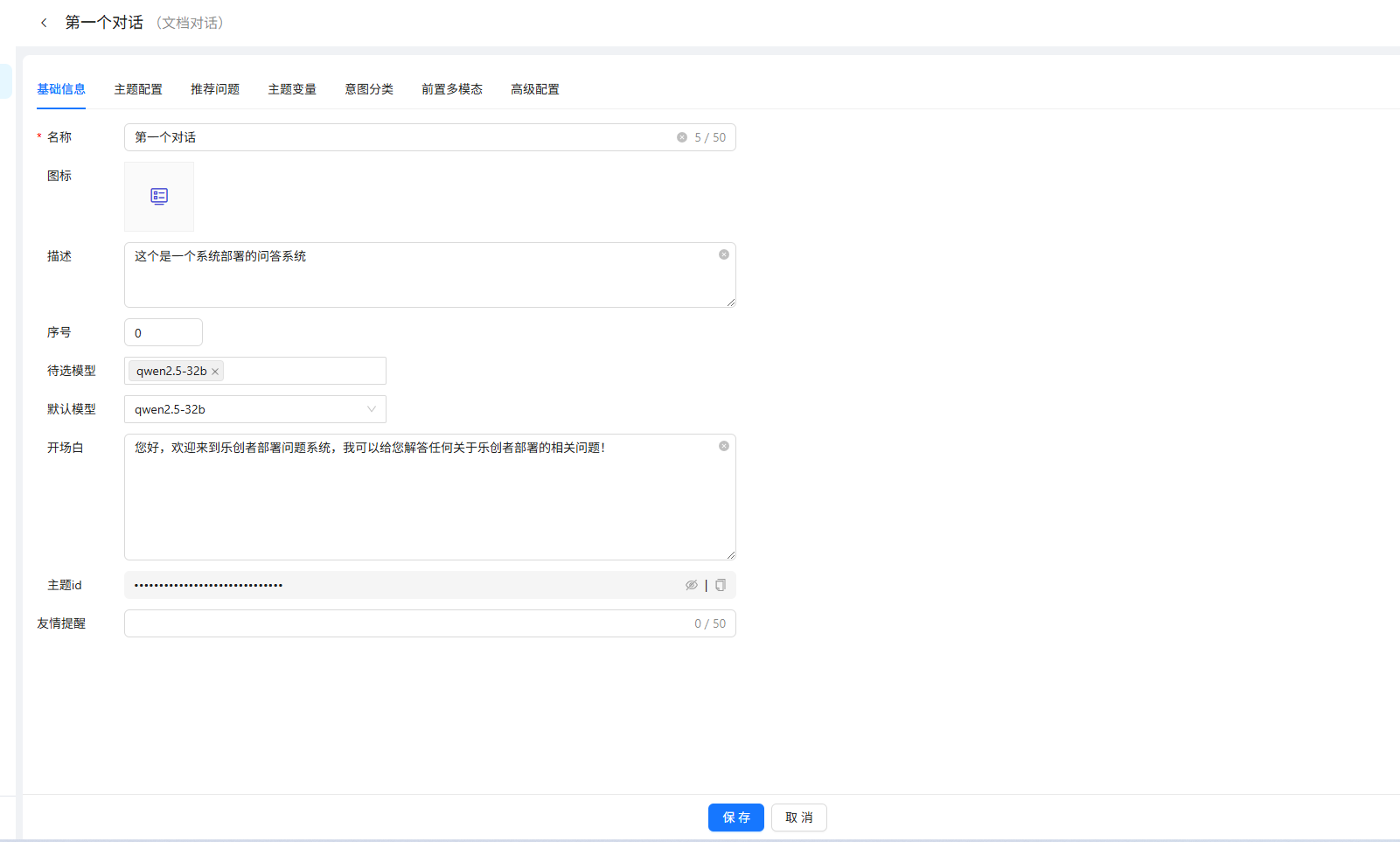 目录 搜索 展开 AI应用开发平台AI 应用开发平台简介准备工作乐创者应用Elasticsearch服务大模型服务文件存储服务知识图谱服务AI基础配置快速入门创建过程第一个对话知识库创建主题创建用户对话知识库知识库概述知识库类型知识库配置文档管理文档维护文档分块文档学习发布/下线文档标注测试召回知识库维护主题主题概述主题配置基础信息知识库配置数据查询数据分析Echarts图表总结分析数据来源乐创者BI检索乐创者BI模板召回参数召回系统提示词文档对话文档对话对话提示词页面AI创作文库对话dify推荐问题主题变量意图分类前置多模态主题预览权限控制菜单控制设计控制监控控制AI会话文库对话文档对话智能问数智能BIAI创作辅助填报案例概述业务实现实现效果 暂无相关搜索结果! 主题创建 1. 创建主题2. 基础配置3. 添加知识库1. 创建主题在主题管理页面创建文档对话主题,如下图所示:2. 基础配置在主题编辑页面可以配置主题基本信息,如下图所示:3. 添加知识库在主题配置中添加知识库,如下图所示:知识库设置完成后保存,完成主题配置。作者:敏 创建时间:2025-06-06 09:53最后编辑:敏 更新时间:2025-10-13 15:33 扫码关注网盛数新公众号,获取更多帮助资料 上一篇:无 下一篇:无