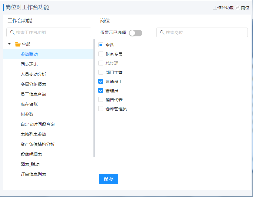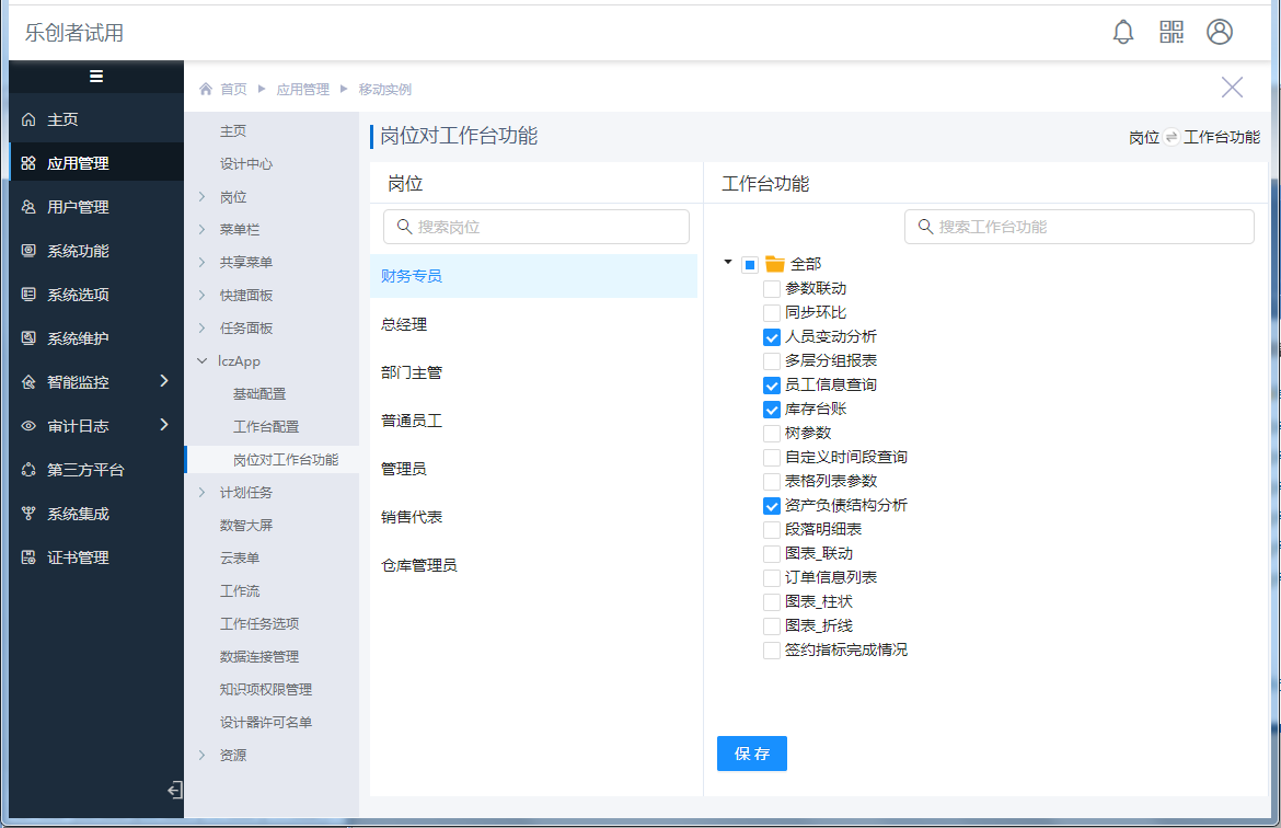 可选中某个岗位(此处只显示功能岗位,可通过“岗位管理”创建功能岗位,参考文档:岗位),勾选1个或多个工作台分类或工作台功能,最后点击“保存”按钮。