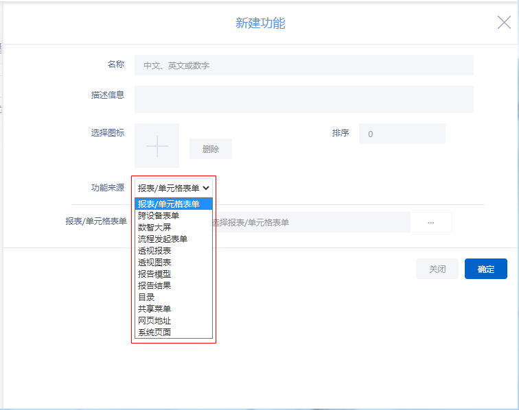 在根目录或某个具体分类下,可点击“新建功能”按钮进入功能配置界面,如下图: