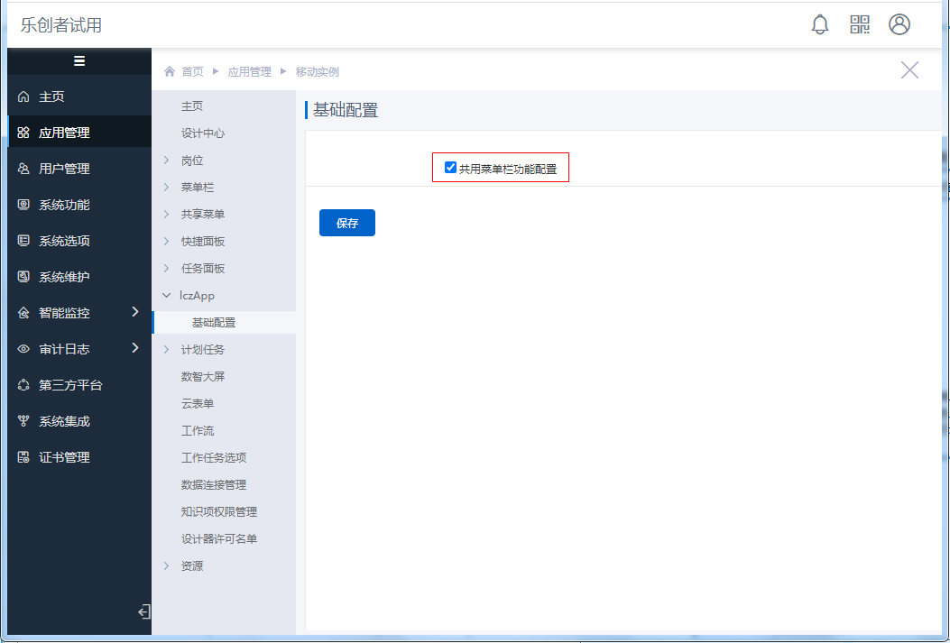 针对使用lczApp的用户,自然也需要显示对应的菜单功能,可以选择共用应用菜单功能的配置,也可以个性化为lczApp单独进行配置。