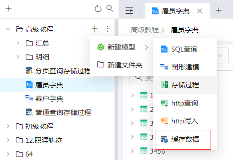 进入数据模型管理界面,点击全局“+”或某目录的“+”选择新建模型“缓存数据”,如下图: