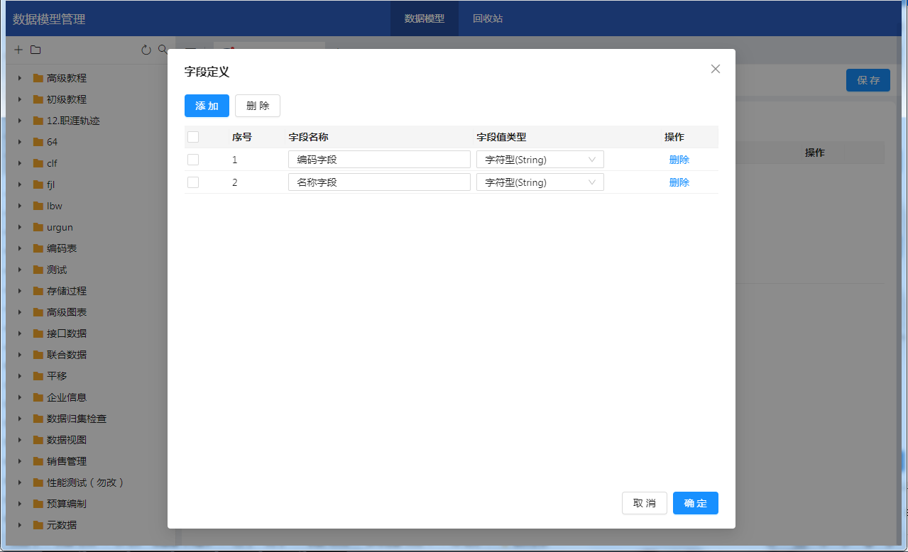 您可以按需增加、删除和修改字段的名称及类型,默认是有“编码字段”和”名称字段”两个字段,可更改。