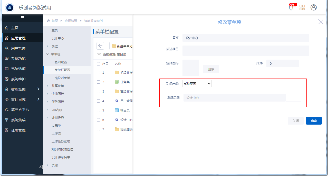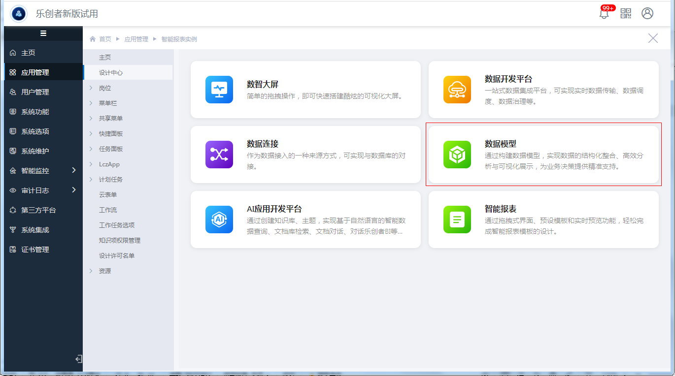 系统管理员或应用管理员通过“应用管理”进入某应用的设计界面,在菜单“设计中心”中可以看到“数据模型”的入口,如下图: