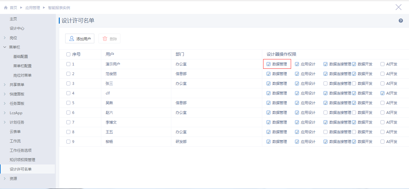 2)在当前应用中的设计器许可名单中拥有“数据管理”权限。