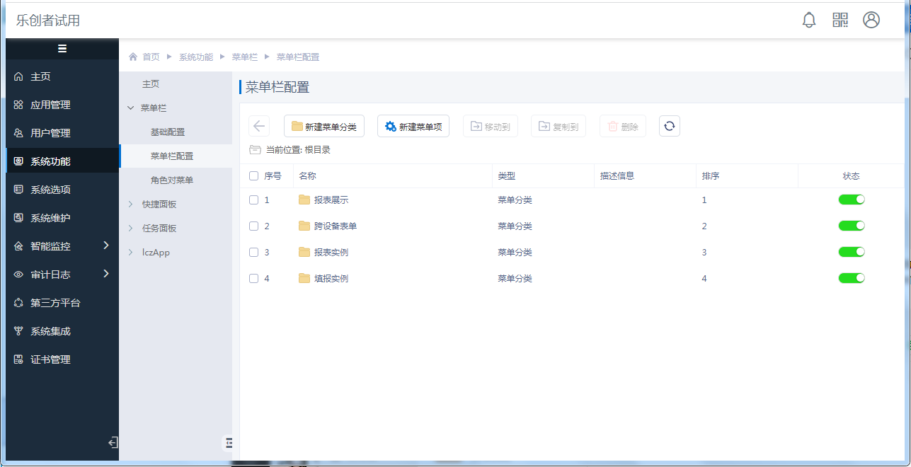 此处的菜单栏主要用于配置外层门户的菜单以及菜单访问权限分配,功能包括:基础配置、菜单栏配置、角色对菜单。