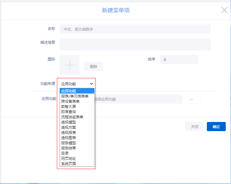 与应用内菜单栏配置功能类似(功能说明可参考文档:应用菜单,这里不再重复介绍),主要不同的是功能配置时支持的功能来源不同,此处支持引用应用功能,如下图: