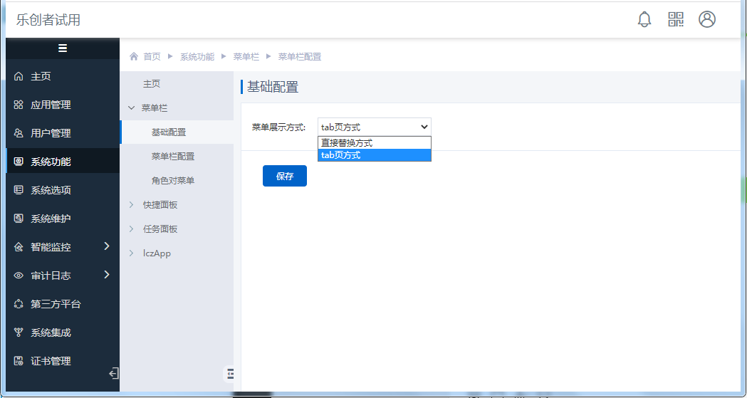 支持配置菜单的展示方式,包括:直接替换方式和tab页方式。