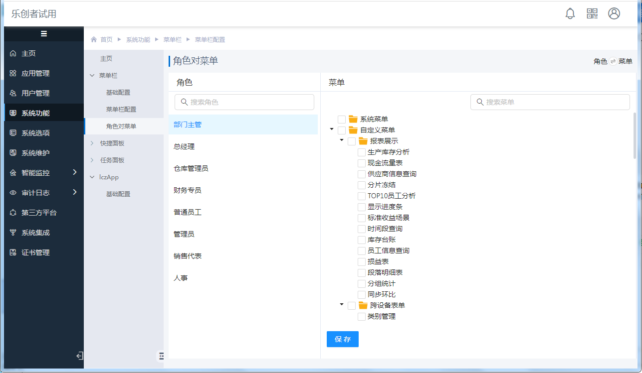 进入“角色对菜单”界面,支持双向配置角色与菜单的映射关系,用户可按需选择。
