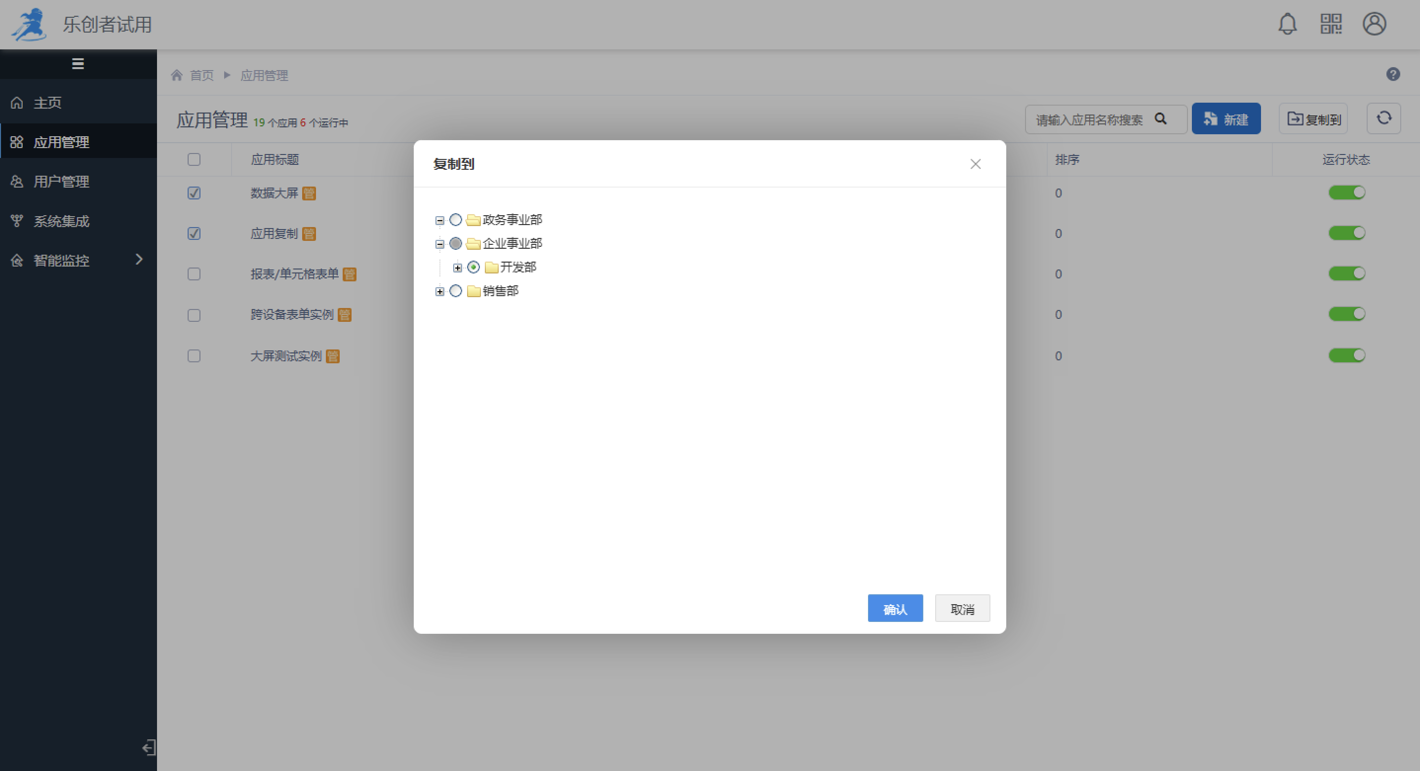 选择后确定将会把所选应用复制到对应机构中,复制的内容包括,应用的配置、状态以及设计的相关功能,其中,用户对岗位、个人空间信息、云表单配置、报表结果信息、知识项权限配置不进行复制。