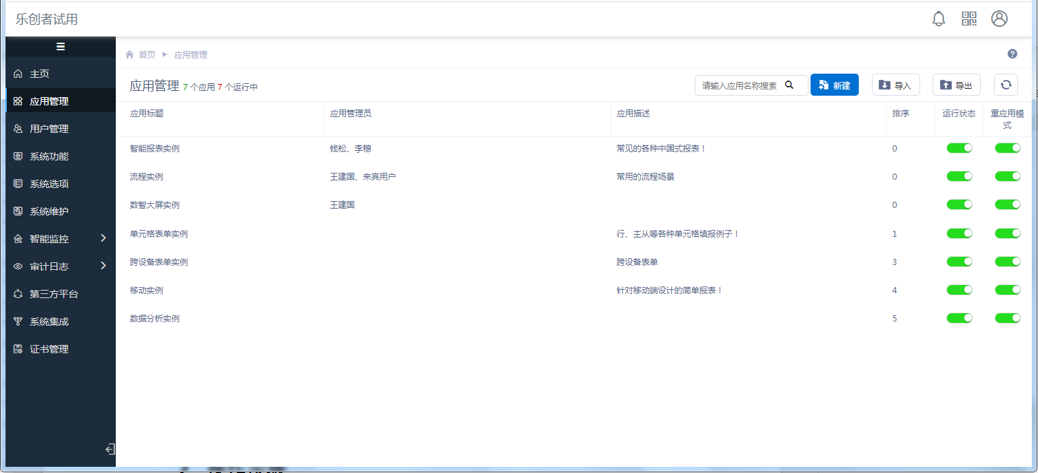 应用管理包括应用的创建、配置、设计等一系列的操作,具体说明如下:
