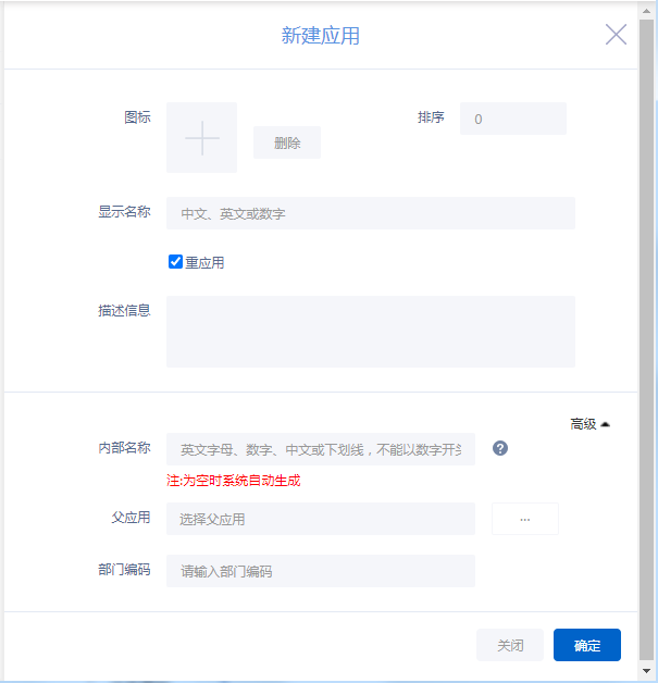 配置显示名称、是否为重应用、图标、描述信息等基本信息即可。