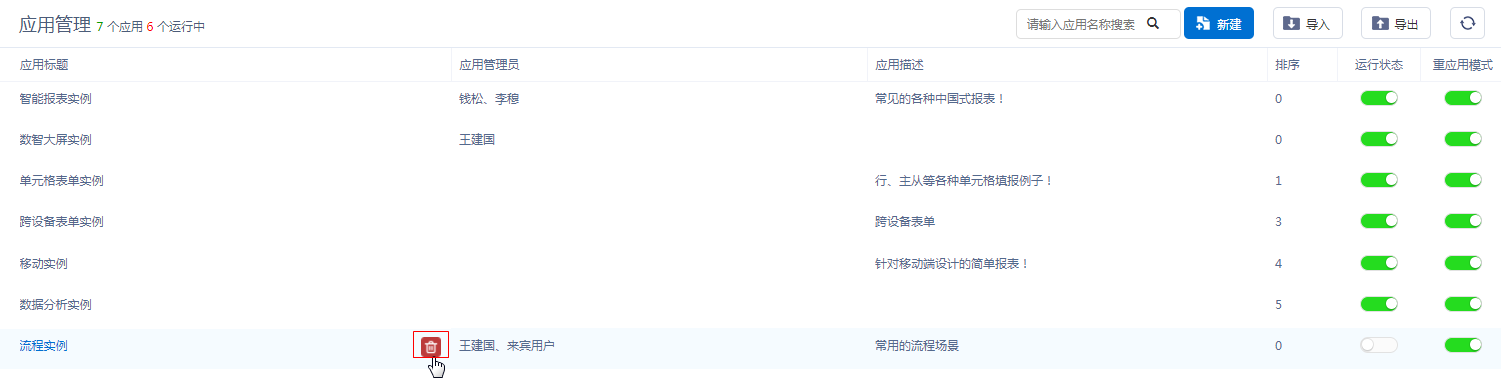 只有应用状态为“禁用”时才允许进行删除操作,删除应用后,将同时删除与该应用相关的所有数据,需要谨慎操作。
