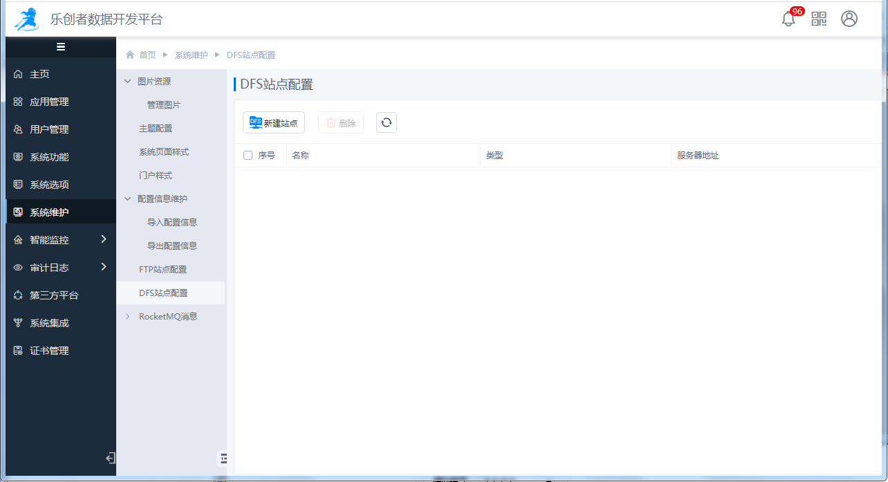 通过“DFS站点配置”可对当前系统需要使用的DFS站点进行统一维护,包括新建、修改和删除操作。如下图:
