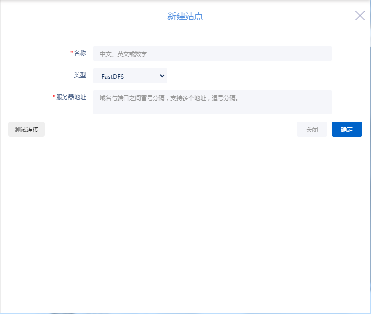 目前仅支持“FastDFS”一种类型,FastDFS是一个开源的轻量级分布式文件系统,它解决了大容量存储和负载均衡的问题,特别适合以文件为载体的在线服务,如相册网站和视频网站。