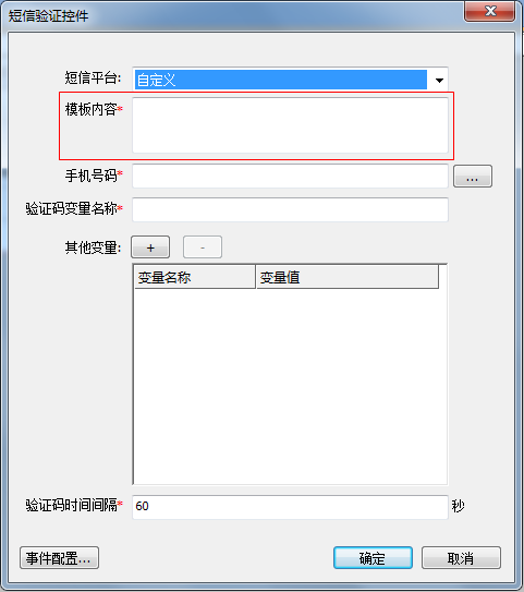 选择“第三方系统》短信”中配置的短信平台,再配置对应的模板,选择自定义类型的短信平台时,需要自定义配置模板内容,如下图: