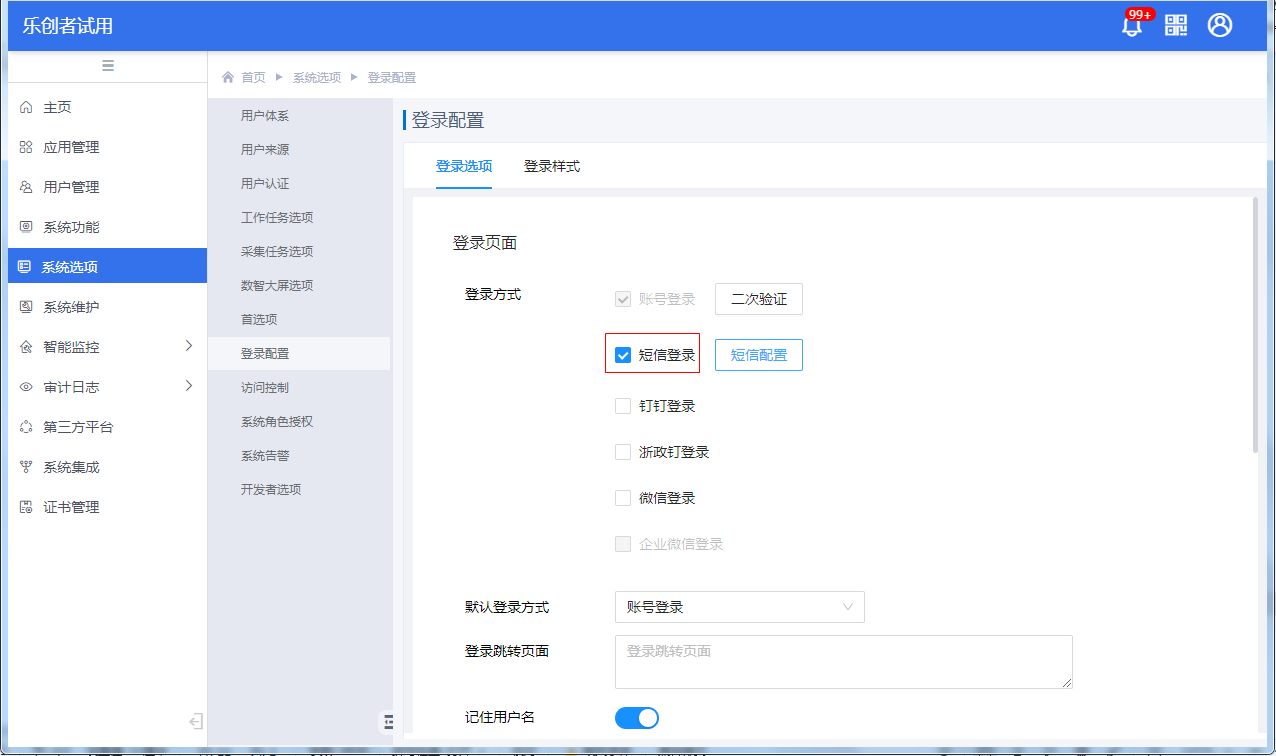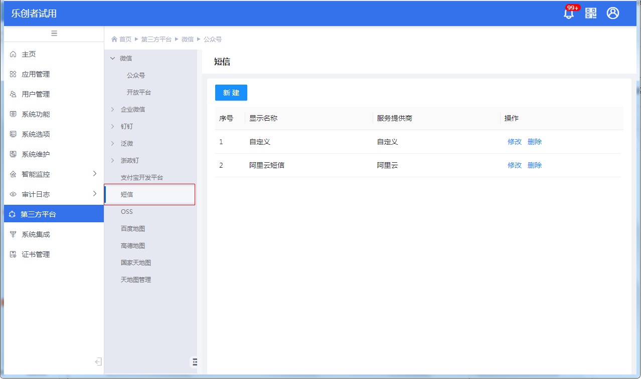 管理员administrator登录乐创者门户,进入“第三方平台>短信”菜单,可定义多套短信,如下图: