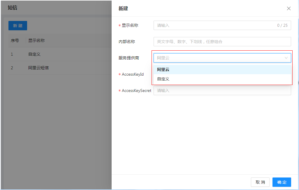 其中,服务提供商支持两种类型:阿里云和自定义,可按需进行选择。