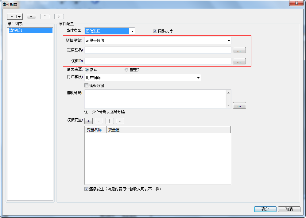 报表全局事件、按钮事件的事件类型选择“短信发送”,选择“第三方系统》短信”中配置的短信平台,再配置对应的模板。