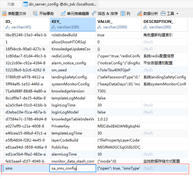 其中,“KEY_”字段填写内容:sa_sms_config;