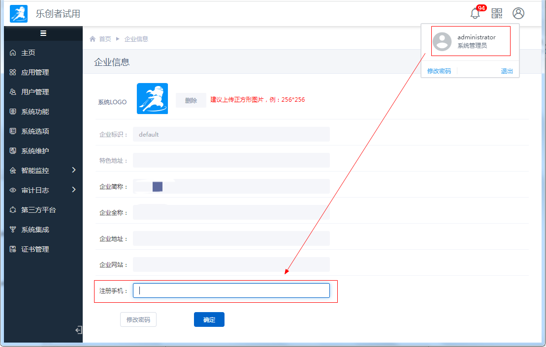 系统管理员的手机号可登录系统后点击头像进行更改,如下图: