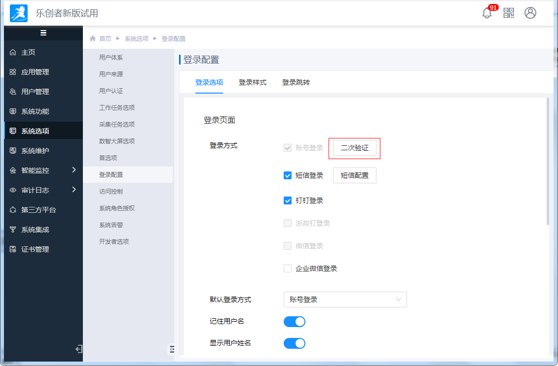 普通用户使用账号密码登录时若需要进行二次验证,则需要系统管理员登录系统,进入“系统选项>登录配置”的“登录选项”tab中,点击“二次验证”按钮,如下图: