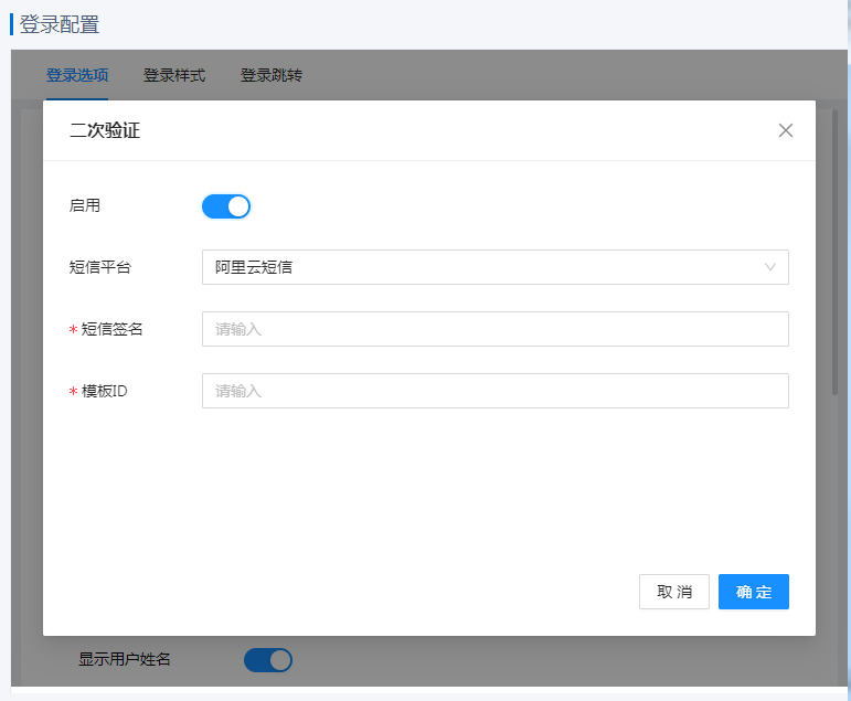 进入二次验证配置界面,开启“启用”,并进行短信配置,如下图: