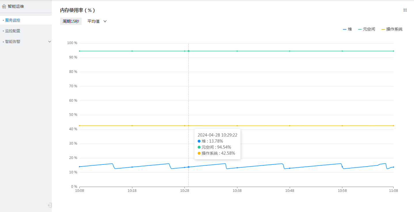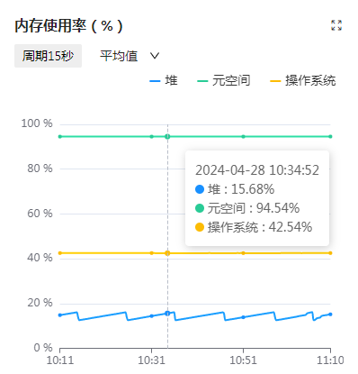 显示某服务在指定时间段内操作系统、堆和元空间的内存使用率,如内存过高可能会导致宕机,需要加大物理内存或中止部分占用内存较多的进程。如下图:
