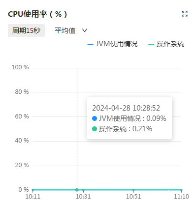 显示某服务在指定时间段内操作系统和JVM的CPU使用率,如CPU使用率过高说明计算压力较大,需要提升CPU性能或排查具体计算任务。如下图: