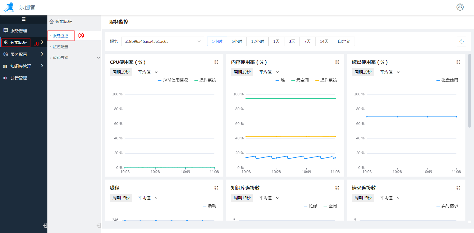 服务监控主要用于监控乐创者应用及相关组件运行的服务器的状态,方便及时关注服务器的各项指标情况,避免影响应用的正常运行。