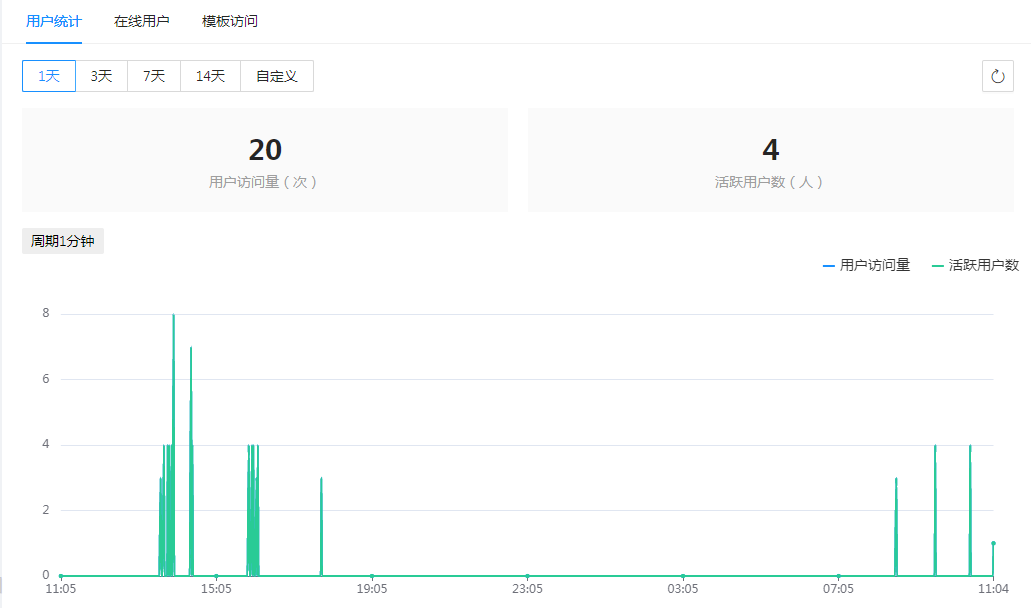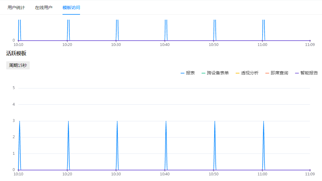 以折线图的方式显示对应时间段内不同时间模板访问量和活跃模板数的变化趋势,如下图: